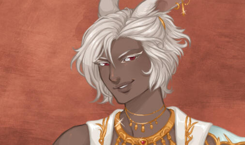 Talaja is a lean but athletic viera. While petite with a delicate face, it is easy to see that years of honing his craft as a dancer formed a toned and fit body with plenty of flexibility. His skin is deeply tanned with golden and ruddy undertones. He often accentuates his dark, wine-colored eyes with a soft cream-tinted paint. Talaja's hair is silky with a slight wave, naturally a pale blonde. It is rare to see him without some form of gold jewelry or adornments and his wardrobe is full of sheer silks and glittery fabrics.